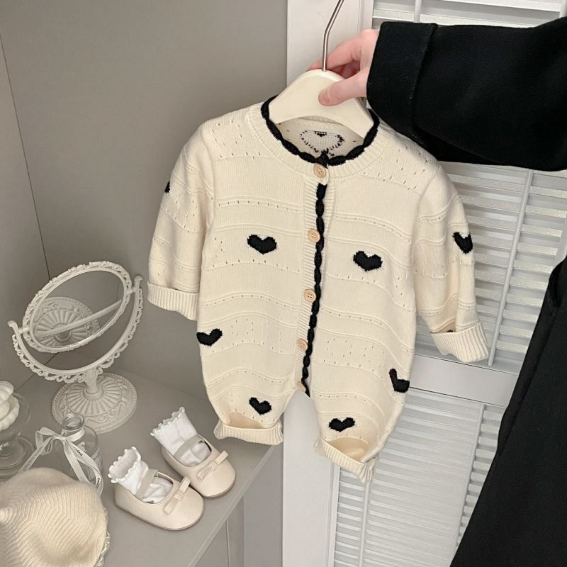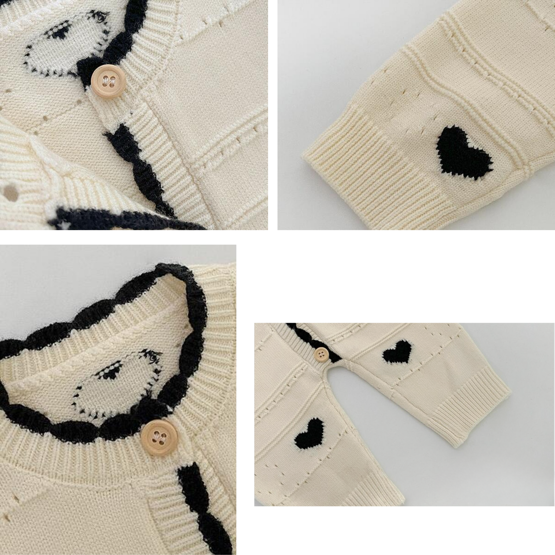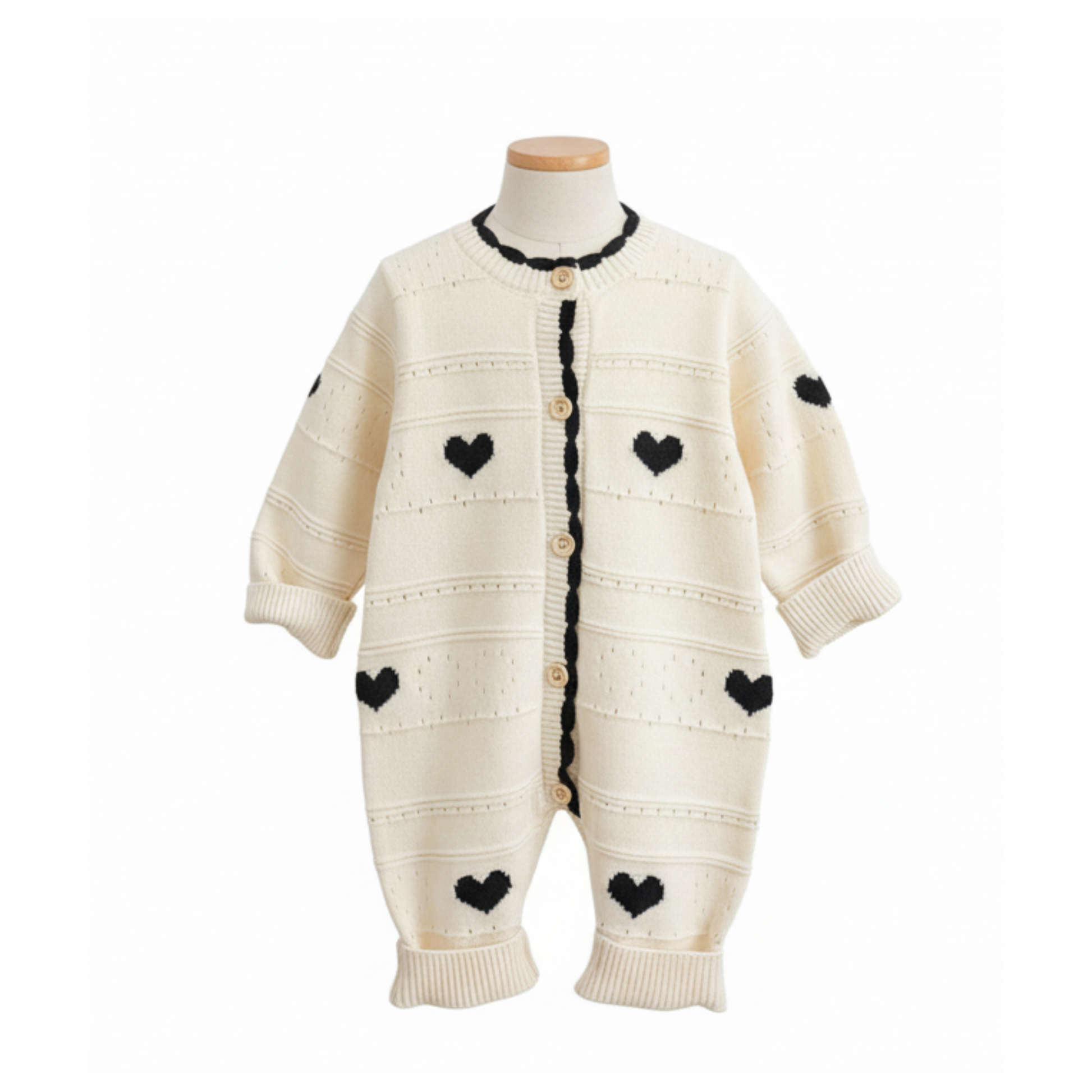 - ブラックのハート柄をちりばめたベビーニットロンパース。