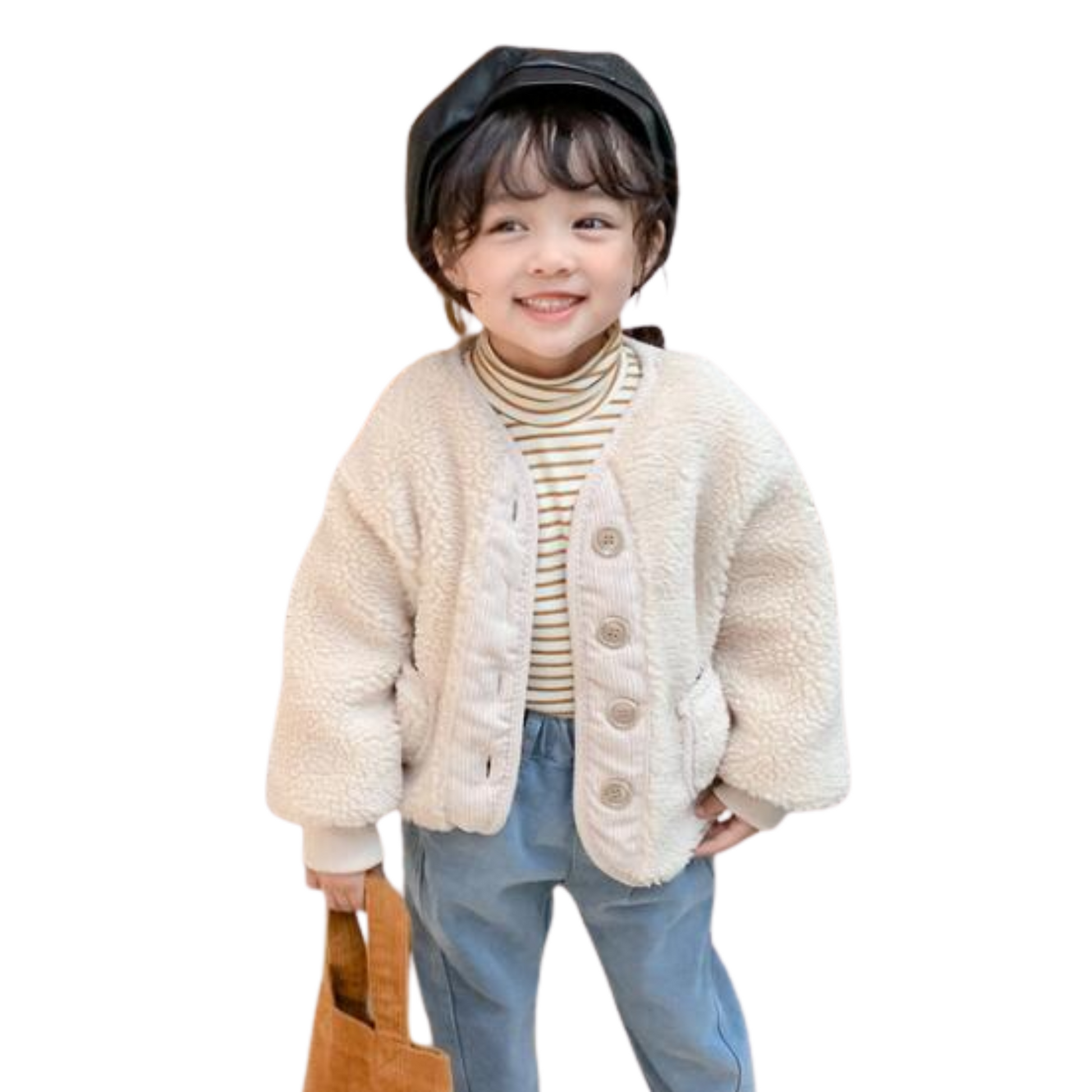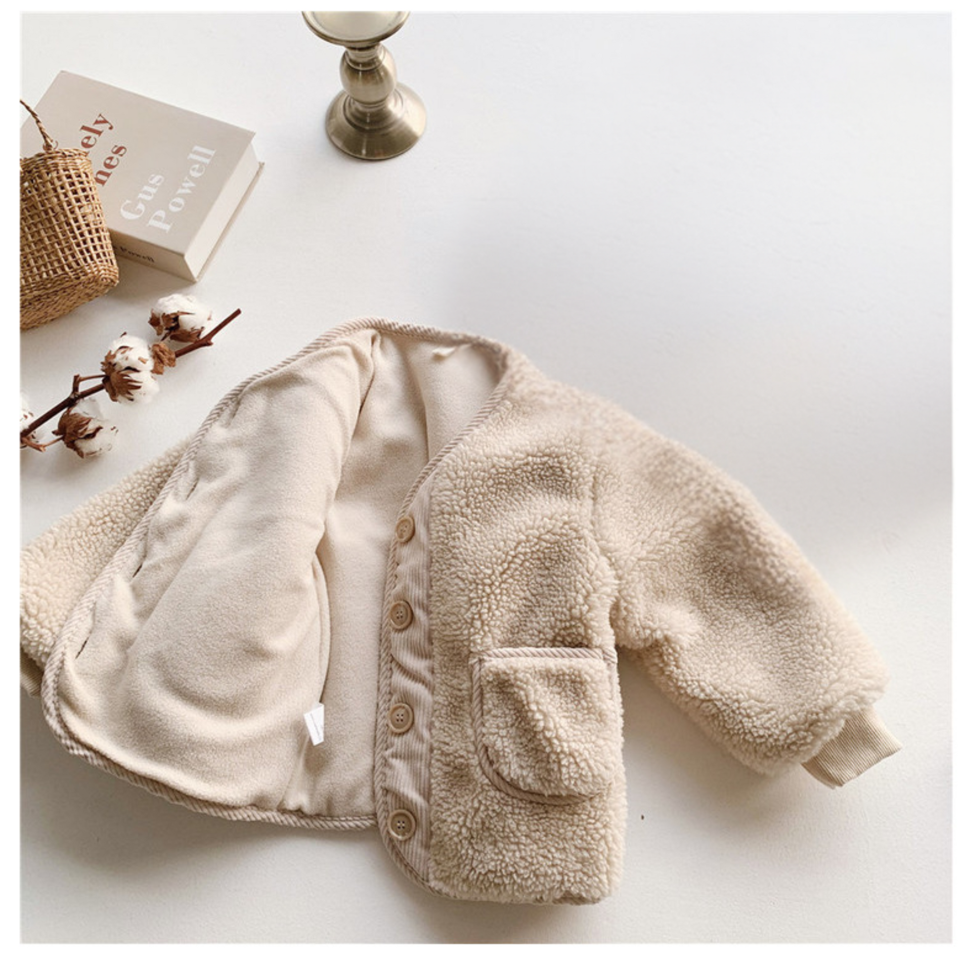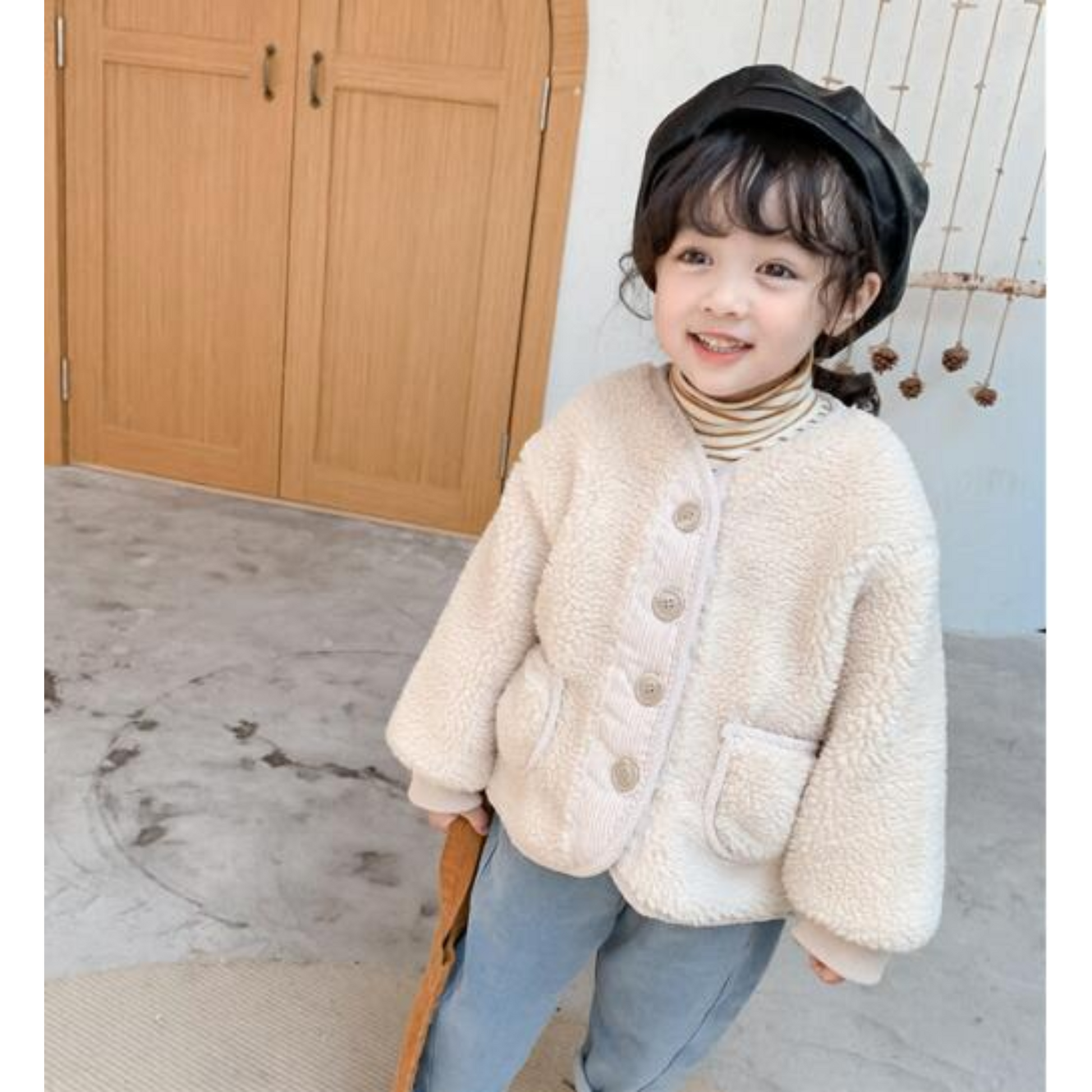 • 丸みのあるシルエットと、大きめボタンが印象的なボアカーデ。